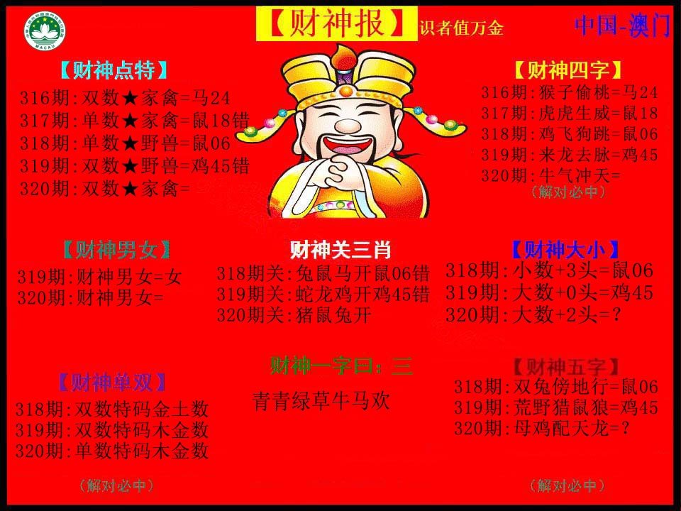 | 320期 | 单:牛蛇羊兔 | 双:虎龙马猴 | 开?00 |